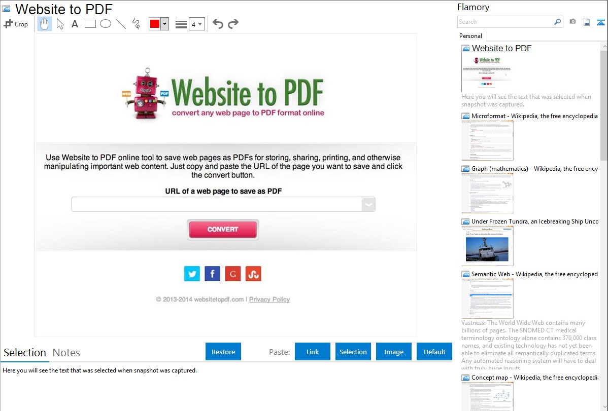 Flamory helps you capture and store screenshots from Website to PDF by pressing a single hotkey. It will be saved to a history, so you can continue doing your tasks without interruptions. Later, you can edit the screenshot: crop, resize, add labels and highlights. After that, you can paste the screenshot into any other document or e-mail message.