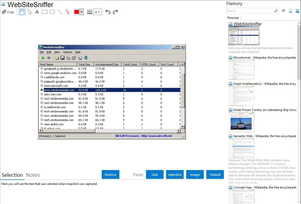 Flamory helps you capture and store screenshots from WebSiteSniffer by pressing a single hotkey. It will be saved to a history, so you can continue doing your tasks without interruptions. Later, you can edit the screenshot: crop, resize, add labels and highlights. After that, you can paste the screenshot into any other document or e-mail message.