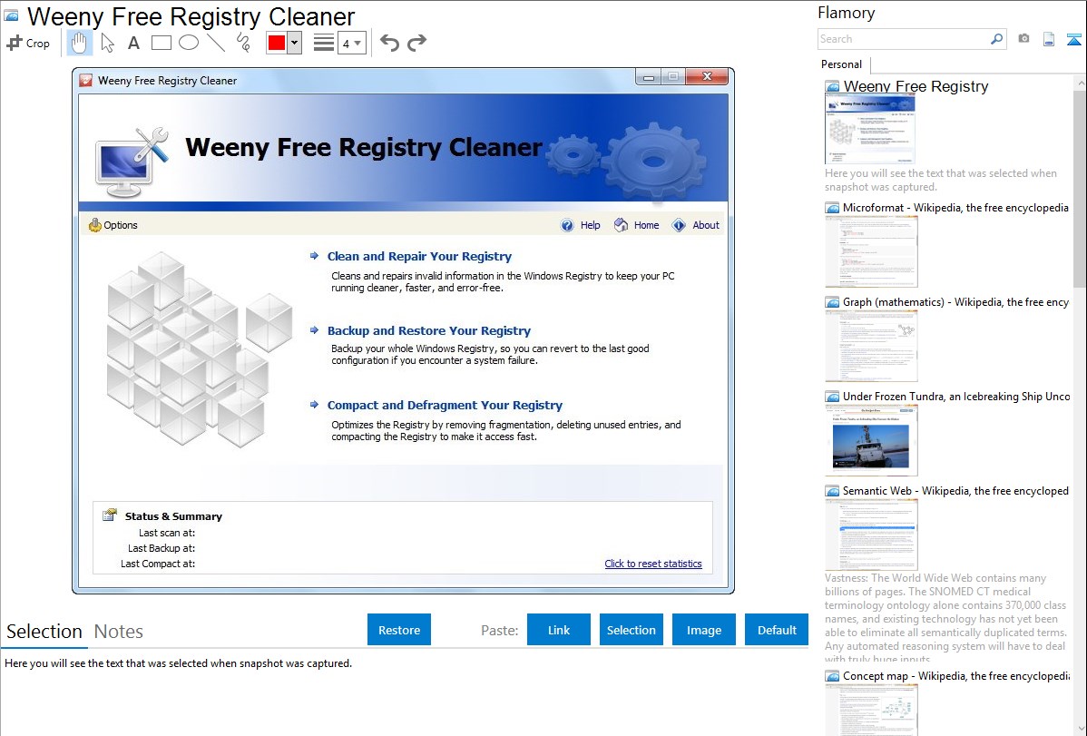Flamory helps you capture and store screenshots from Weeny Free Registry Cleaner by pressing a single hotkey. It will be saved to a history, so you can continue doing your tasks without interruptions. Later, you can edit the screenshot: crop, resize, add labels and highlights. After that, you can paste the screenshot into any other document or e-mail message.