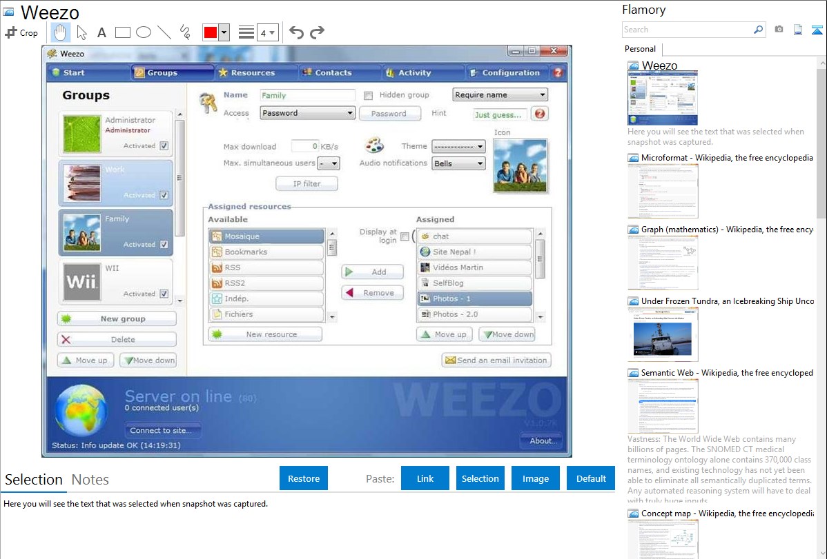 Flamory helps you capture and store screenshots from Weezo by pressing a single hotkey. It will be saved to a history, so you can continue doing your tasks without interruptions. Later, you can edit the screenshot: crop, resize, add labels and highlights. After that, you can paste the screenshot into any other document or e-mail message.
