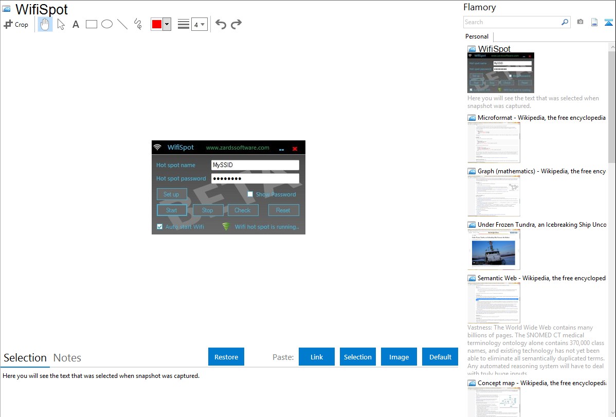 Flamory helps you capture and store screenshots from WifiSpot by pressing a single hotkey. It will be saved to a history, so you can continue doing your tasks without interruptions. Later, you can edit the screenshot: crop, resize, add labels and highlights. After that, you can paste the screenshot into any other document or e-mail message.