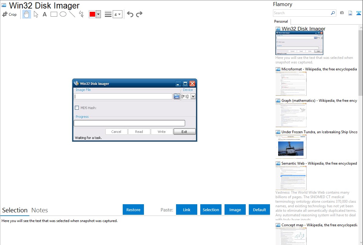 Flamory helps you capture and store screenshots from Win32 Disk Imager by pressing a single hotkey. It will be saved to a history, so you can continue doing your tasks without interruptions. Later, you can edit the screenshot: crop, resize, add labels and highlights. After that, you can paste the screenshot into any other document or e-mail message.