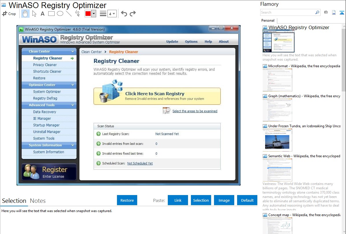 Flamory helps you capture and store screenshots from WinASO Registry Optimizer by pressing a single hotkey. It will be saved to a history, so you can continue doing your tasks without interruptions. Later, you can edit the screenshot: crop, resize, add labels and highlights. After that, you can paste the screenshot into any other document or e-mail message.