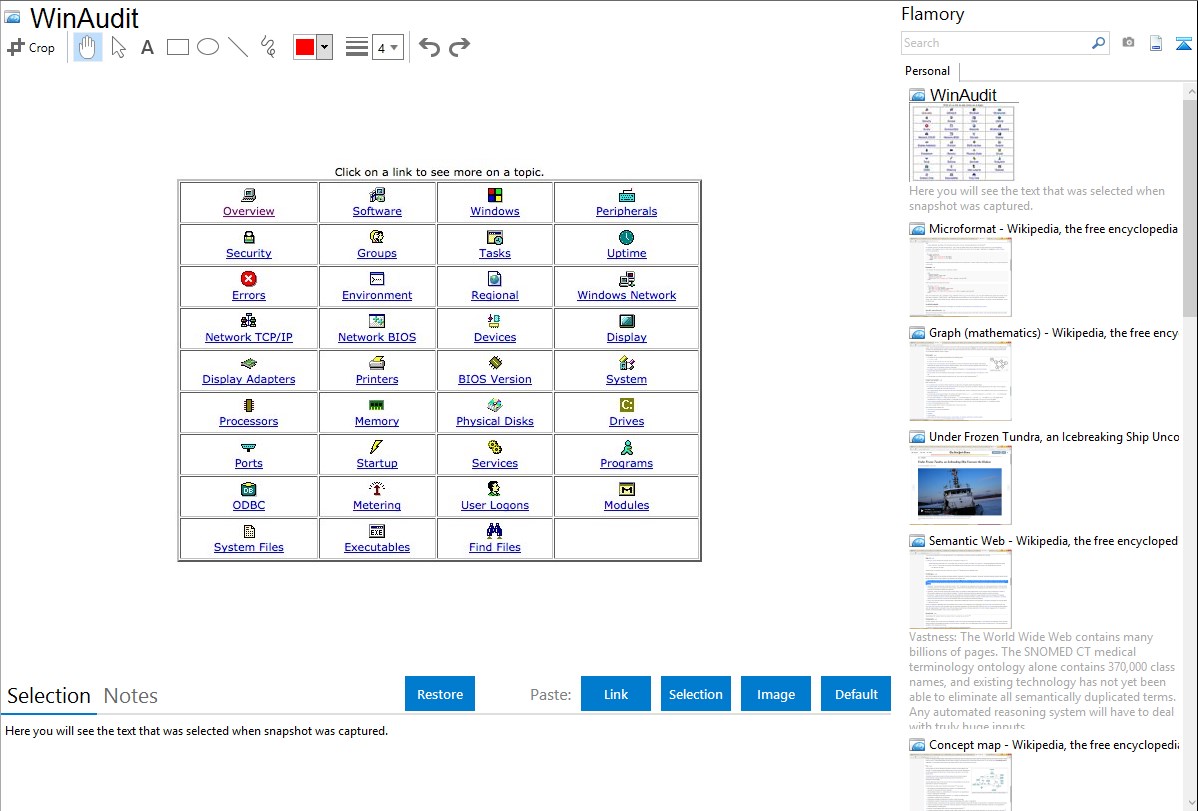 Flamory helps you capture and store screenshots from WinAudit by pressing a single hotkey. It will be saved to a history, so you can continue doing your tasks without interruptions. Later, you can edit the screenshot: crop, resize, add labels and highlights. After that, you can paste the screenshot into any other document or e-mail message.