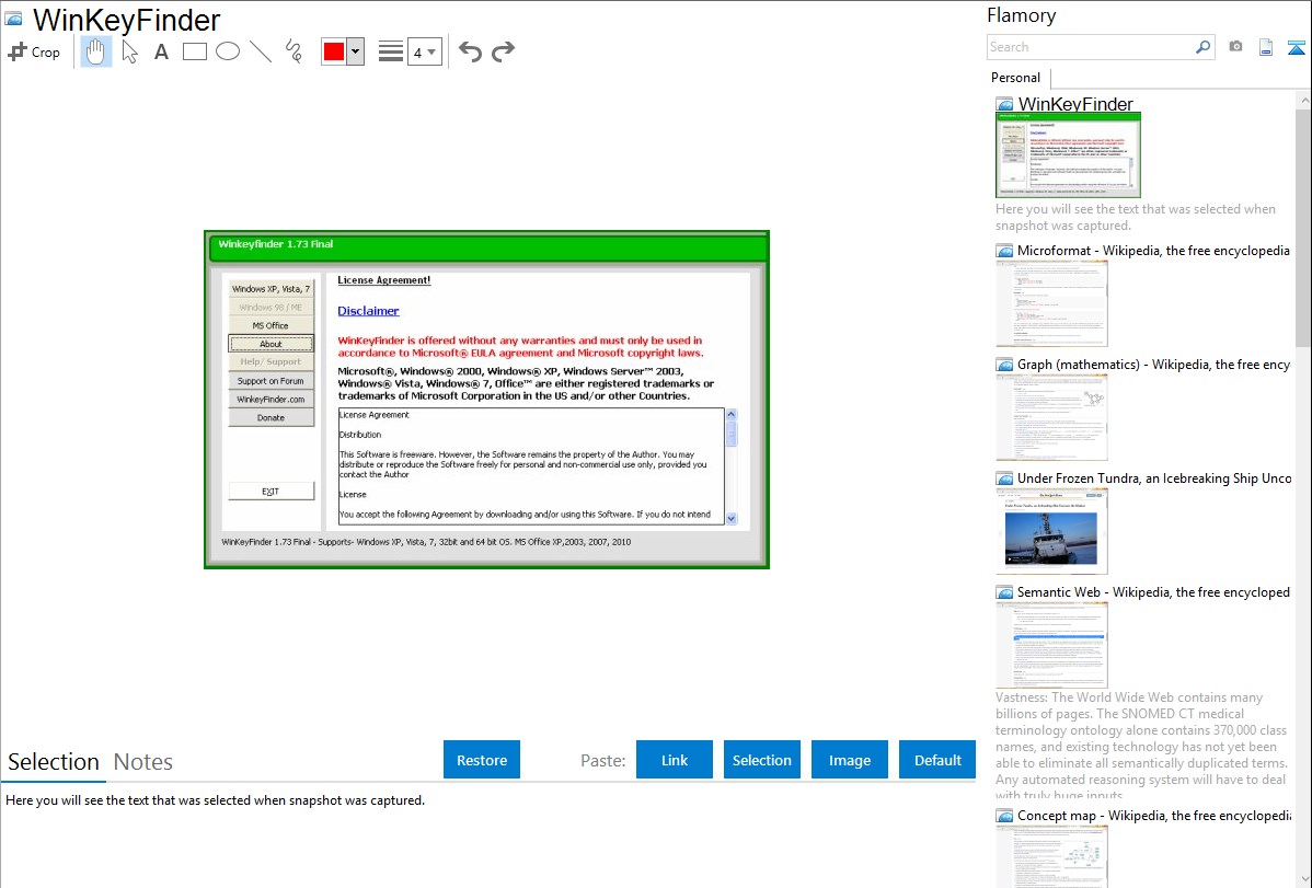 Flamory helps you capture and store screenshots from WinKeyFinder by pressing a single hotkey. It will be saved to a history, so you can continue doing your tasks without interruptions. Later, you can edit the screenshot: crop, resize, add labels and highlights. After that, you can paste the screenshot into any other document or e-mail message.