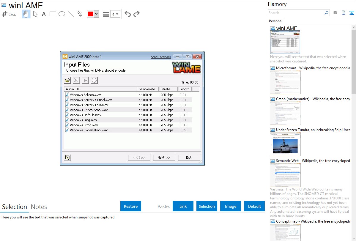 Flamory helps you capture and store screenshots from winLAME by pressing a single hotkey. It will be saved to a history, so you can continue doing your tasks without interruptions. Later, you can edit the screenshot: crop, resize, add labels and highlights. After that, you can paste the screenshot into any other document or e-mail message.