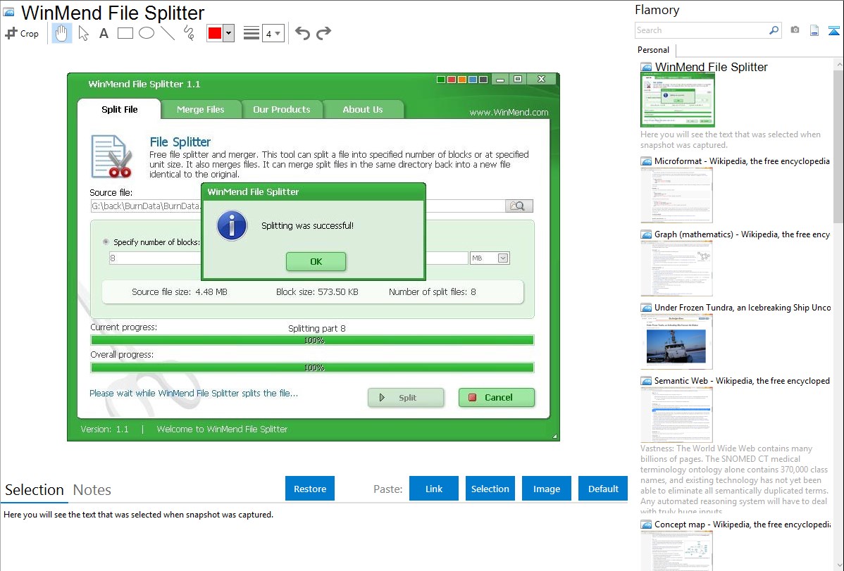 Flamory helps you capture and store screenshots from WinMend File Splitter by pressing a single hotkey. It will be saved to a history, so you can continue doing your tasks without interruptions. Later, you can edit the screenshot: crop, resize, add labels and highlights. After that, you can paste the screenshot into any other document or e-mail message.