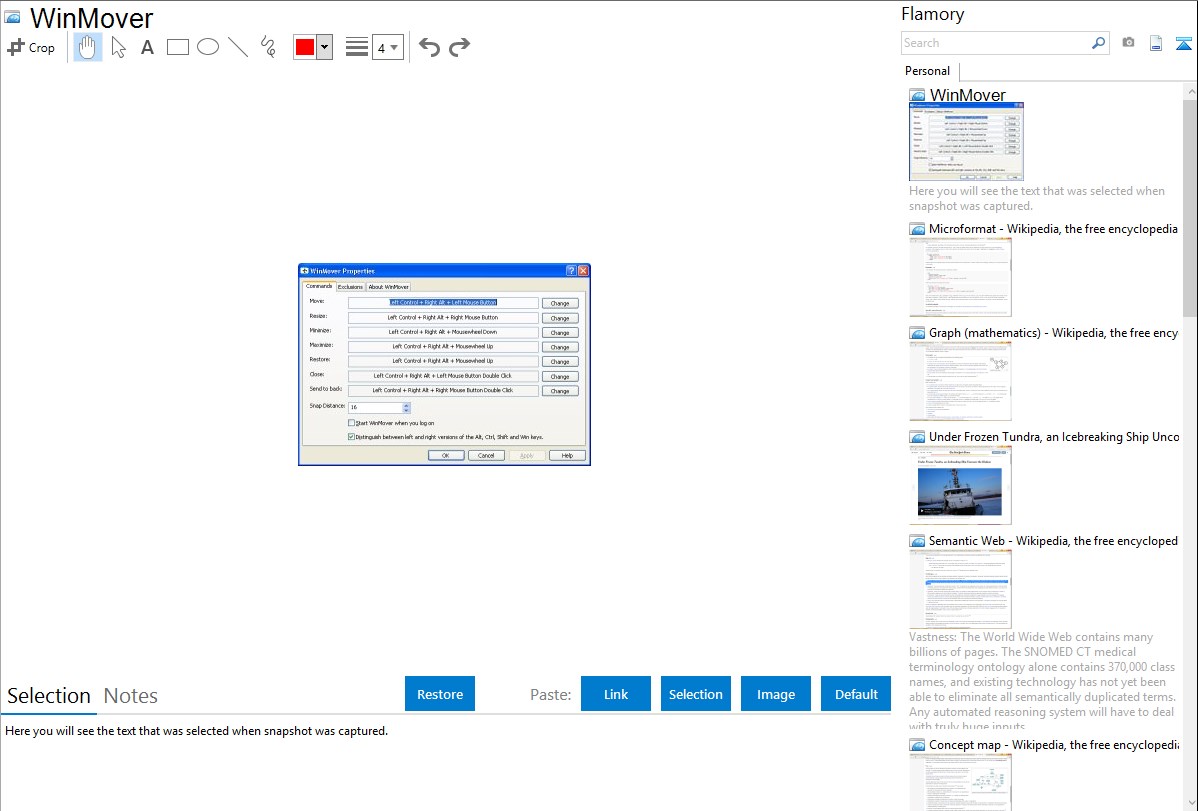 Flamory helps you capture and store screenshots from WinMover by pressing a single hotkey. It will be saved to a history, so you can continue doing your tasks without interruptions. Later, you can edit the screenshot: crop, resize, add labels and highlights. After that, you can paste the screenshot into any other document or e-mail message.