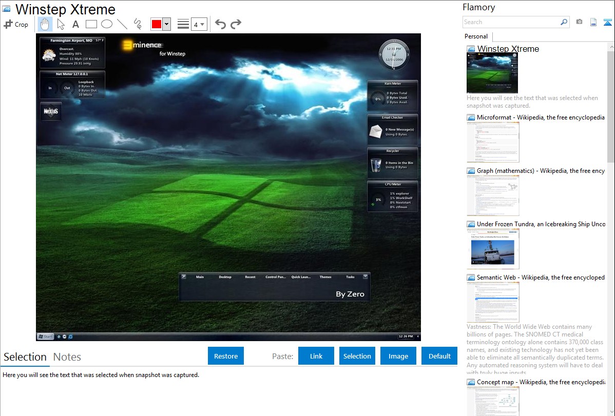 Flamory helps you capture and store screenshots from Winstep Xtreme by pressing a single hotkey. It will be saved to a history, so you can continue doing your tasks without interruptions. Later, you can edit the screenshot: crop, resize, add labels and highlights. After that, you can paste the screenshot into any other document or e-mail message.