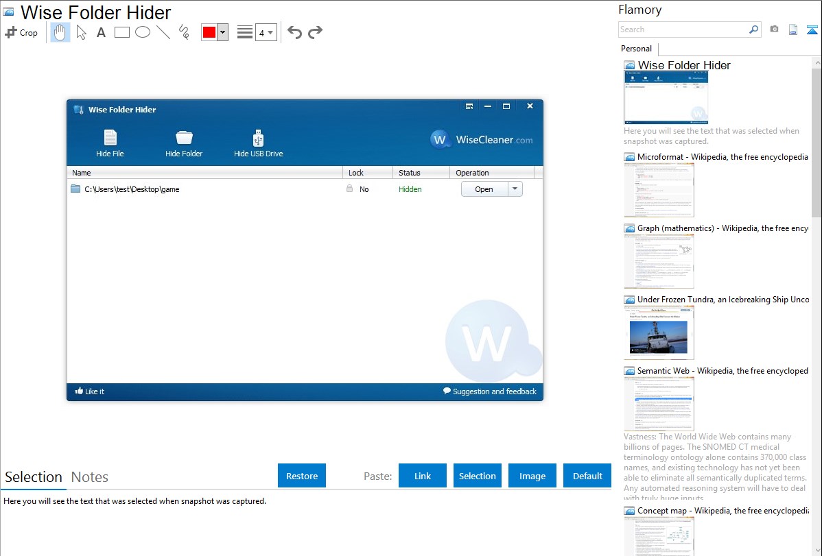 Flamory helps you capture and store screenshots from Wise Folder Hider by pressing a single hotkey. It will be saved to a history, so you can continue doing your tasks without interruptions. Later, you can edit the screenshot: crop, resize, add labels and highlights. After that, you can paste the screenshot into any other document or e-mail message.