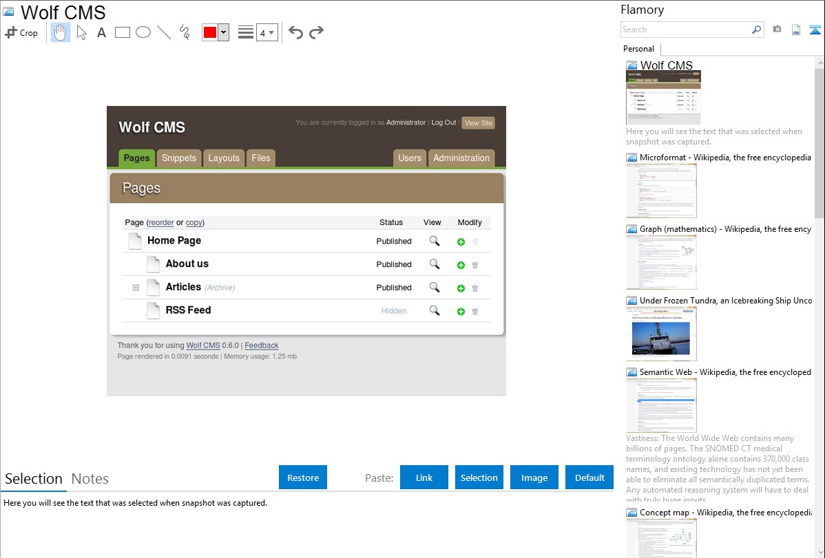 Flamory helps you capture and store screenshots from Wolf CMS by pressing a single hotkey. It will be saved to a history, so you can continue doing your tasks without interruptions. Later, you can edit the screenshot: crop, resize, add labels and highlights. After that, you can paste the screenshot into any other document or e-mail message.