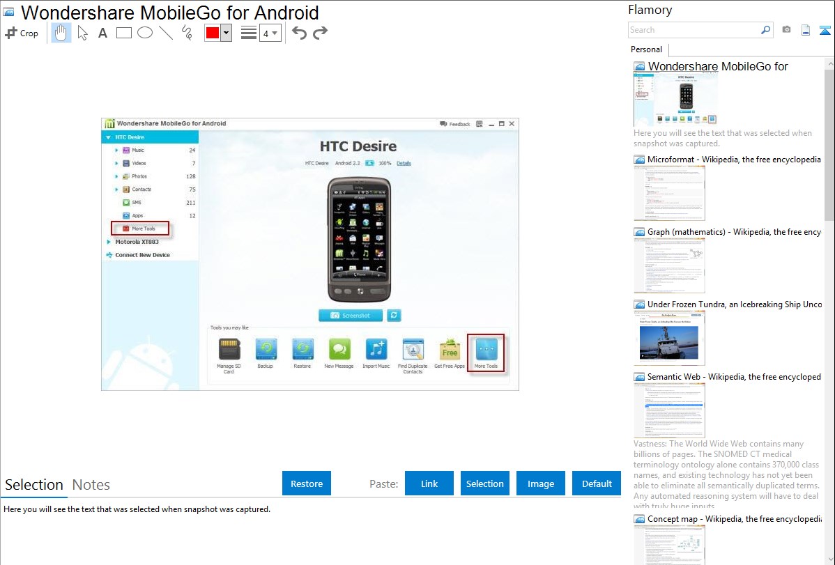 Flamory helps you capture and store screenshots from Wondershare MobileGo for Android by pressing a single hotkey. It will be saved to a history, so you can continue doing your tasks without interruptions. Later, you can edit the screenshot: crop, resize, add labels and highlights. After that, you can paste the screenshot into any other document or e-mail message.