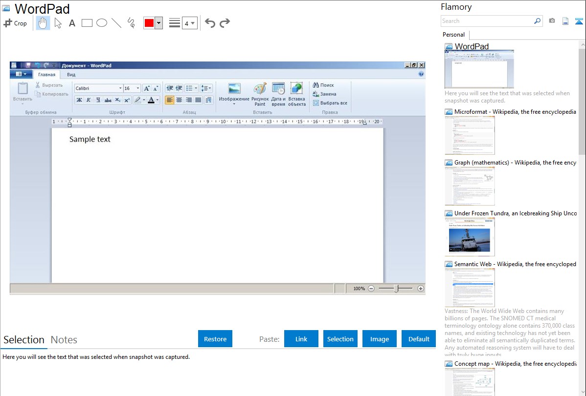 Flamory helps you capture and store screenshots from WordPad by pressing a single hotkey. It will be saved to a history, so you can continue doing your tasks without interruptions. Later, you can edit the screenshot: crop, resize, add labels and highlights. After that, you can paste the screenshot into any other document or e-mail message.