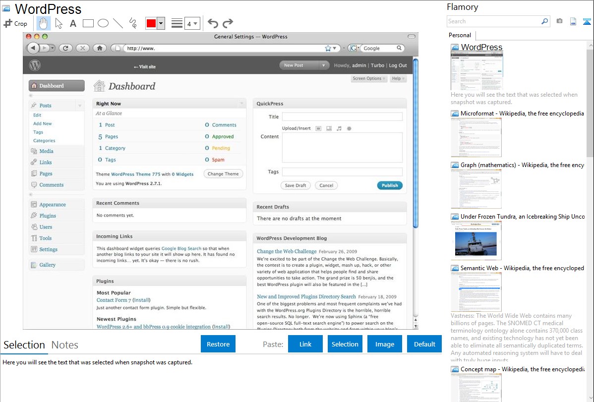 Flamory helps you capture and store screenshots from WordPress by pressing a single hotkey. It will be saved to a history, so you can continue doing your tasks without interruptions. Later, you can edit the screenshot: crop, resize, add labels and highlights. After that, you can paste the screenshot into any other document or e-mail message.