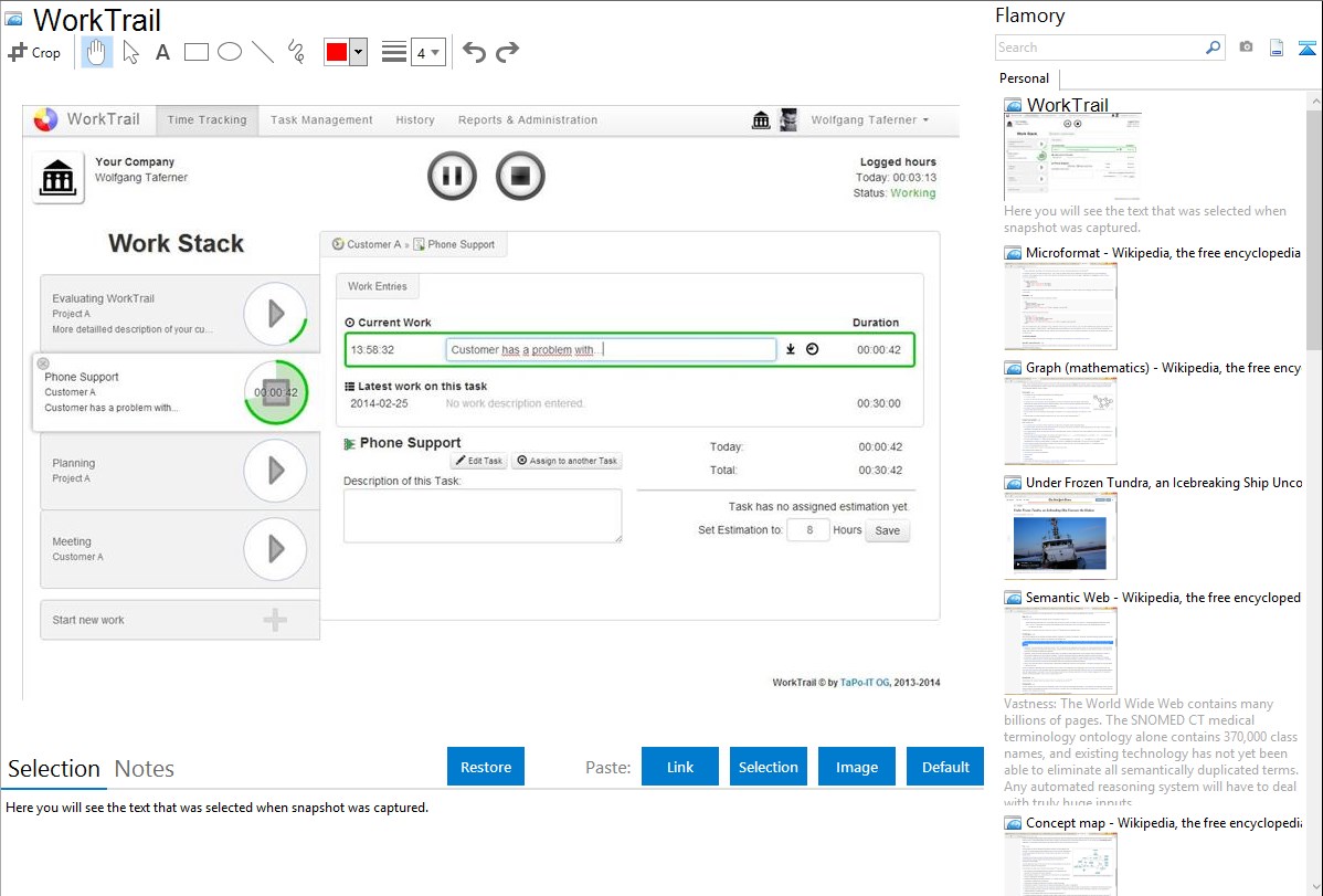 Flamory helps you capture and store screenshots from WorkTrail by pressing a single hotkey. It will be saved to a history, so you can continue doing your tasks without interruptions. Later, you can edit the screenshot: crop, resize, add labels and highlights. After that, you can paste the screenshot into any other document or e-mail message.