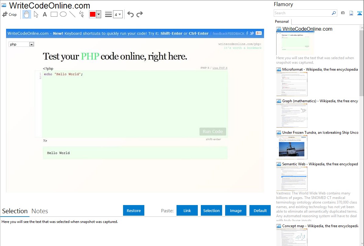Flamory helps you capture and store screenshots from WriteCodeOnline.com by pressing a single hotkey. It will be saved to a history, so you can continue doing your tasks without interruptions. Later, you can edit the screenshot: crop, resize, add labels and highlights. After that, you can paste the screenshot into any other document or e-mail message.