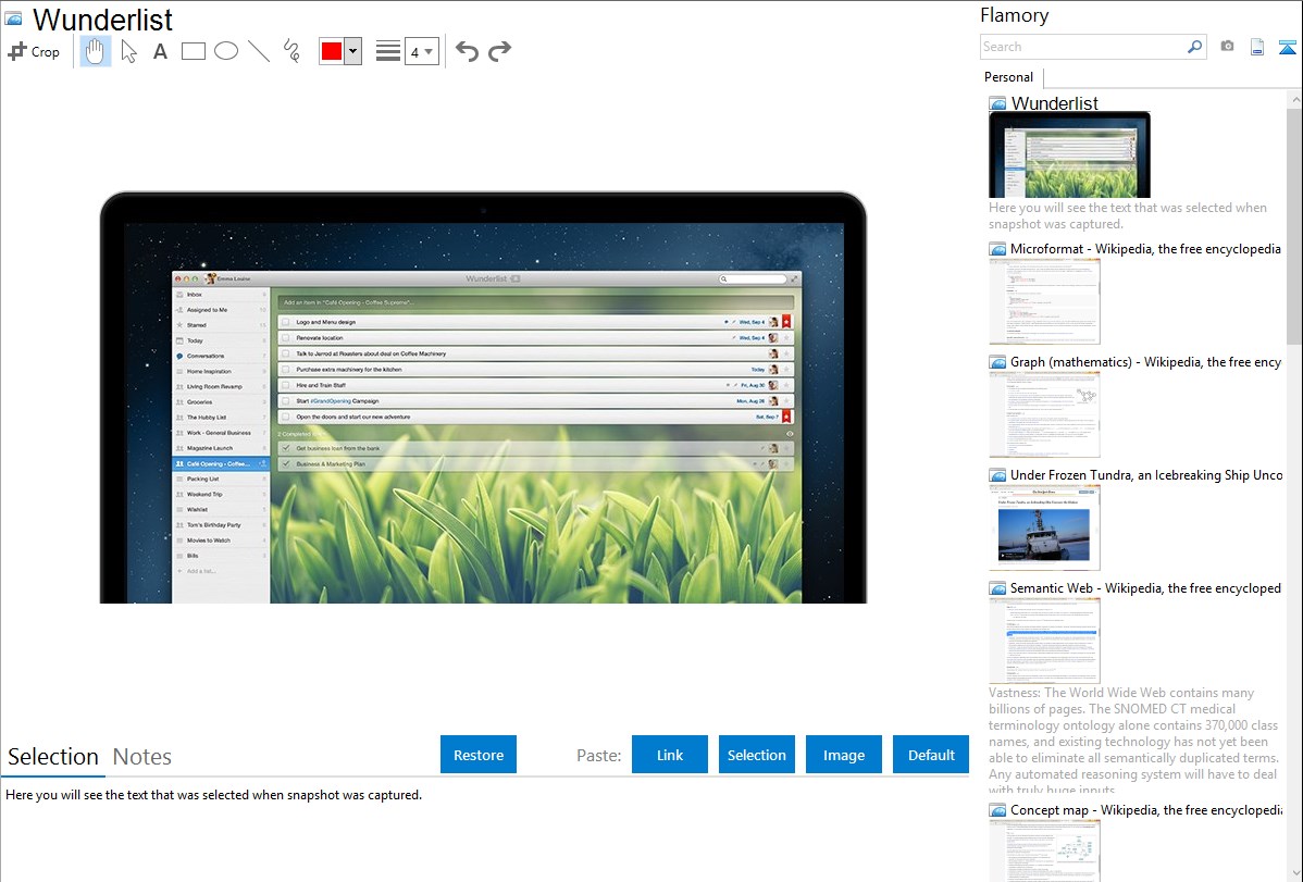 Flamory helps you capture and store screenshots from Wunderlist by pressing a single hotkey. It will be saved to a history, so you can continue doing your tasks without interruptions. Later, you can edit the screenshot: crop, resize, add labels and highlights. After that, you can paste the screenshot into any other document or e-mail message.
