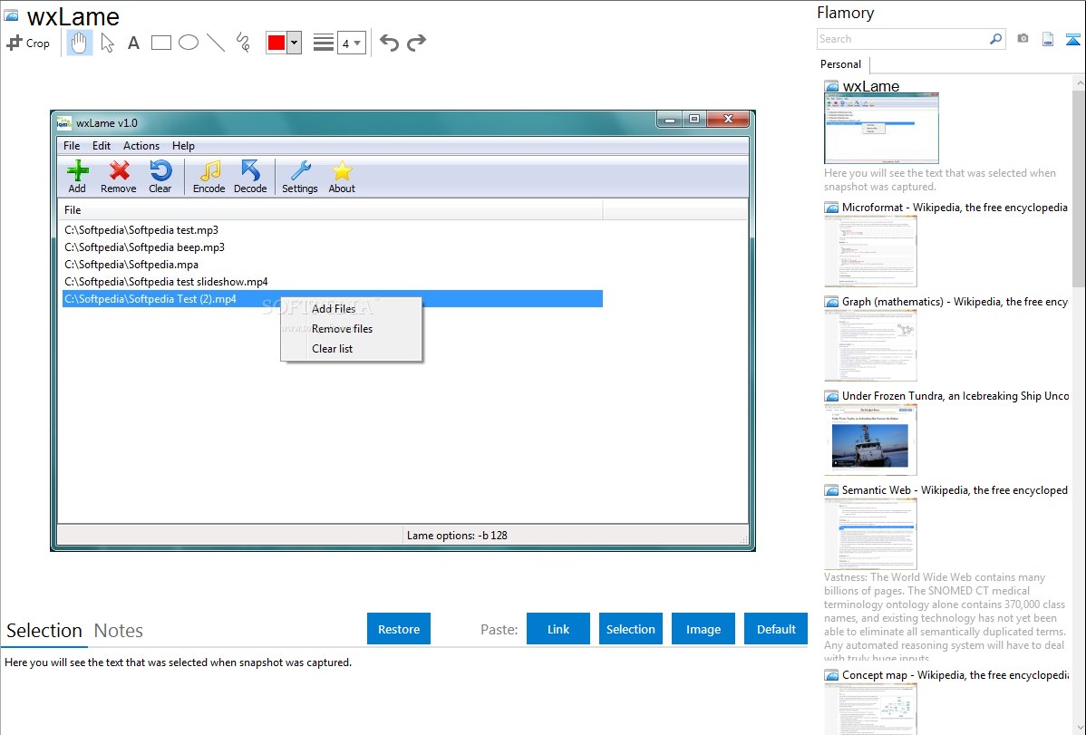 Flamory helps you capture and store screenshots from wxLame by pressing a single hotkey. It will be saved to a history, so you can continue doing your tasks without interruptions. Later, you can edit the screenshot: crop, resize, add labels and highlights. After that, you can paste the screenshot into any other document or e-mail message.