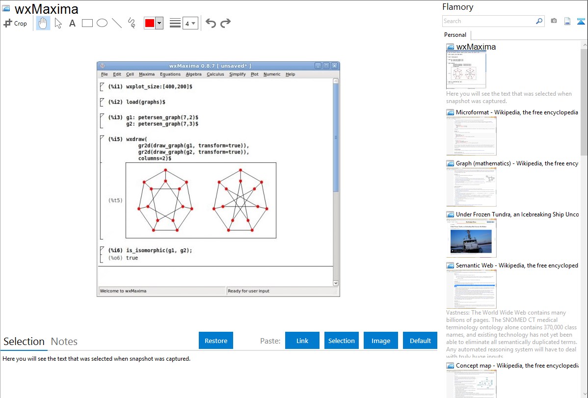 Flamory helps you capture and store screenshots from wxMaxima by pressing a single hotkey. It will be saved to a history, so you can continue doing your tasks without interruptions. Later, you can edit the screenshot: crop, resize, add labels and highlights. After that, you can paste the screenshot into any other document or e-mail message.