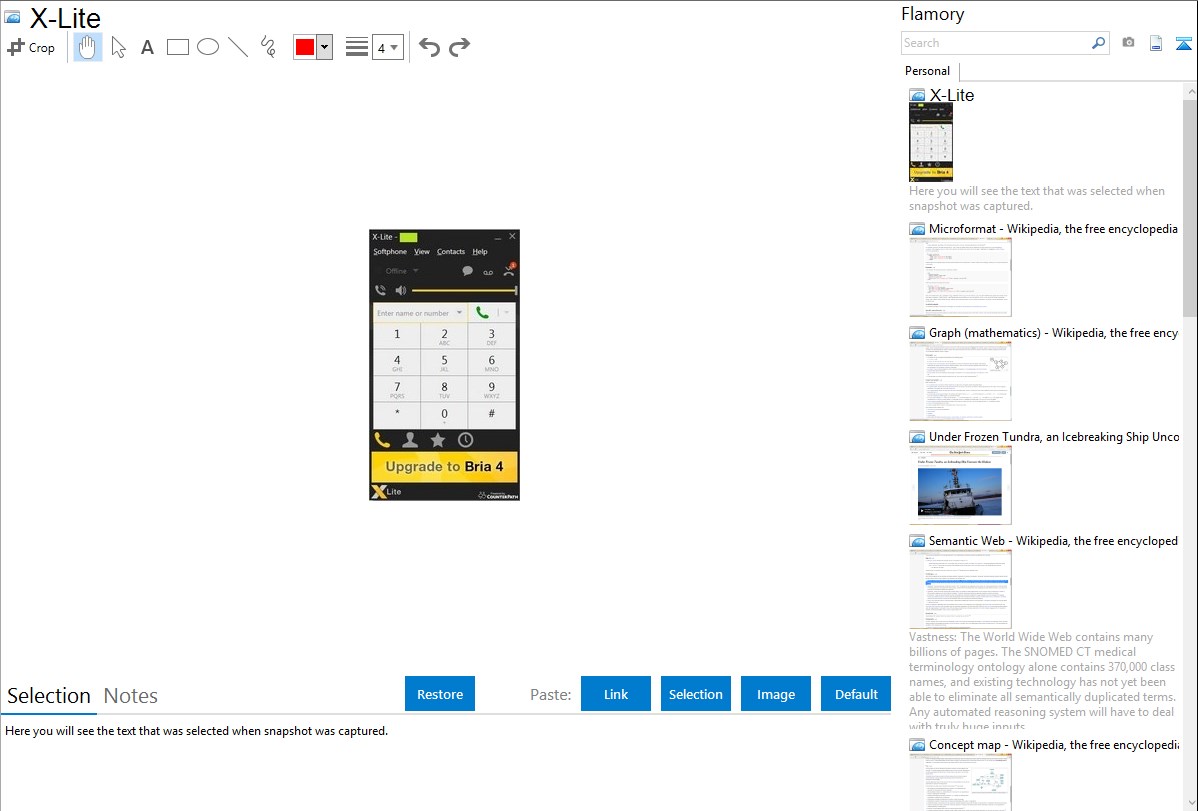 Flamory helps you capture and store screenshots from X-Lite by pressing a single hotkey. It will be saved to a history, so you can continue doing your tasks without interruptions. Later, you can edit the screenshot: crop, resize, add labels and highlights. After that, you can paste the screenshot into any other document or e-mail message.