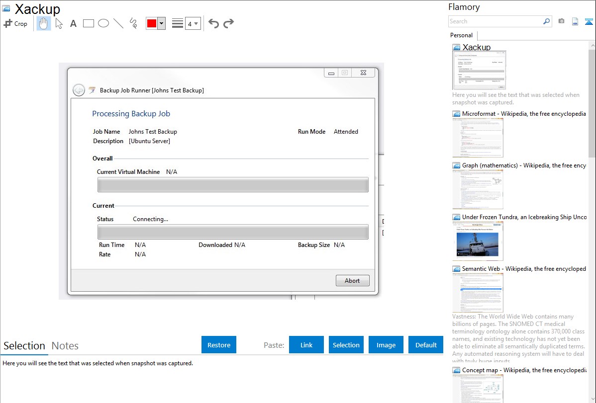 Flamory helps you capture and store screenshots from Xackup by pressing a single hotkey. It will be saved to a history, so you can continue doing your tasks without interruptions. Later, you can edit the screenshot: crop, resize, add labels and highlights. After that, you can paste the screenshot into any other document or e-mail message.