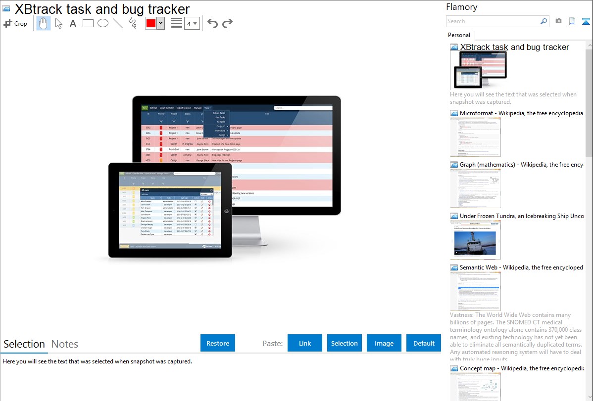 Flamory provides advanced bookmarking for XBtrack task and bug tracker. It captures screen, selection, text on the page and other context. You can find this bookmark later using search by page content or looking through thumbnail list.