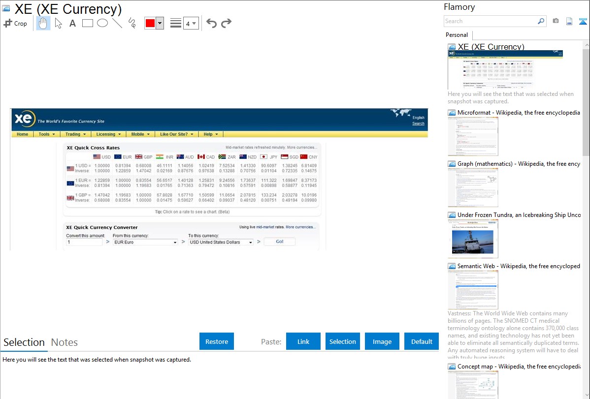 Flamory helps you capture and store screenshots from XE (XE Currency) by pressing a single hotkey. It will be saved to a history, so you can continue doing your tasks without interruptions. Later, you can edit the screenshot: crop, resize, add labels and highlights. After that, you can paste the screenshot into any other document or e-mail message.