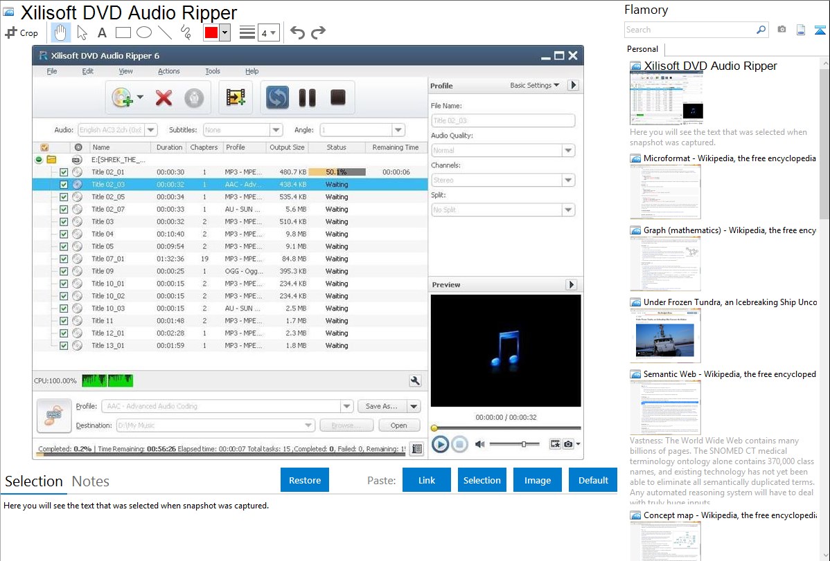 Flamory helps you capture and store screenshots from Xilisoft DVD Audio Ripper by pressing a single hotkey. It will be saved to a history, so you can continue doing your tasks without interruptions. Later, you can edit the screenshot: crop, resize, add labels and highlights. After that, you can paste the screenshot into any other document or e-mail message.