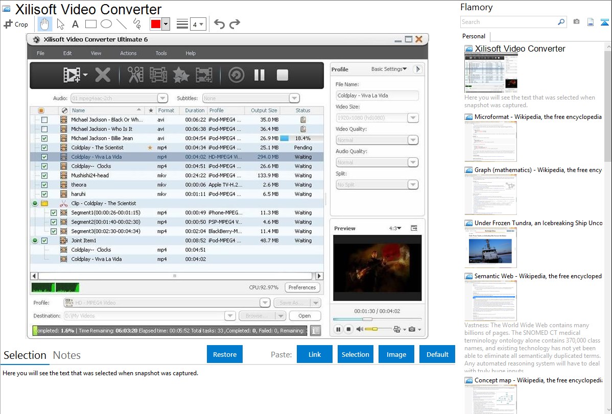 Flamory helps you capture and store screenshots from Xilisoft Video Converter by pressing a single hotkey. It will be saved to a history, so you can continue doing your tasks without interruptions. Later, you can edit the screenshot: crop, resize, add labels and highlights. After that, you can paste the screenshot into any other document or e-mail message.