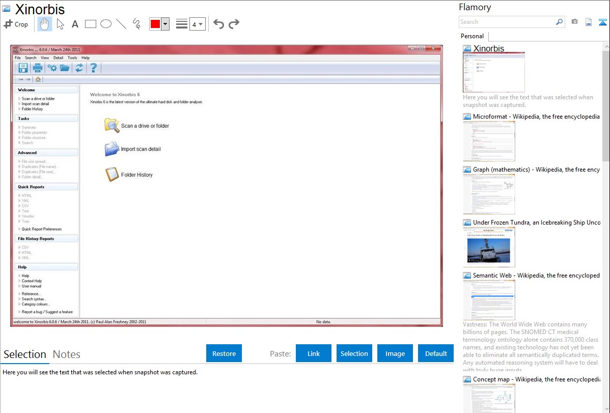 Flamory helps you capture and store screenshots from Xinorbis by pressing a single hotkey. It will be saved to a history, so you can continue doing your tasks without interruptions. Later, you can edit the screenshot: crop, resize, add labels and highlights. After that, you can paste the screenshot into any other document or e-mail message.