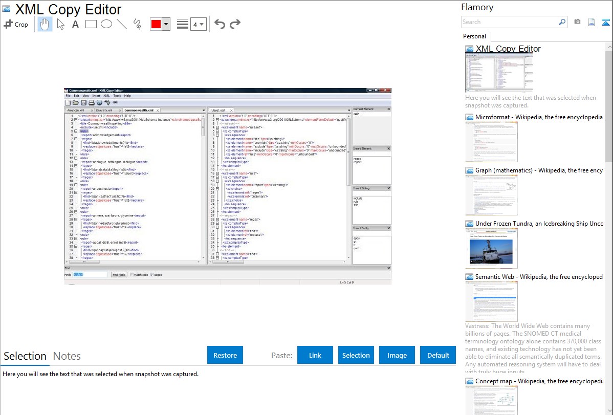 Flamory helps you capture and store screenshots from XML Copy Editor by pressing a single hotkey. It will be saved to a history, so you can continue doing your tasks without interruptions. Later, you can edit the screenshot: crop, resize, add labels and highlights. After that, you can paste the screenshot into any other document or e-mail message.