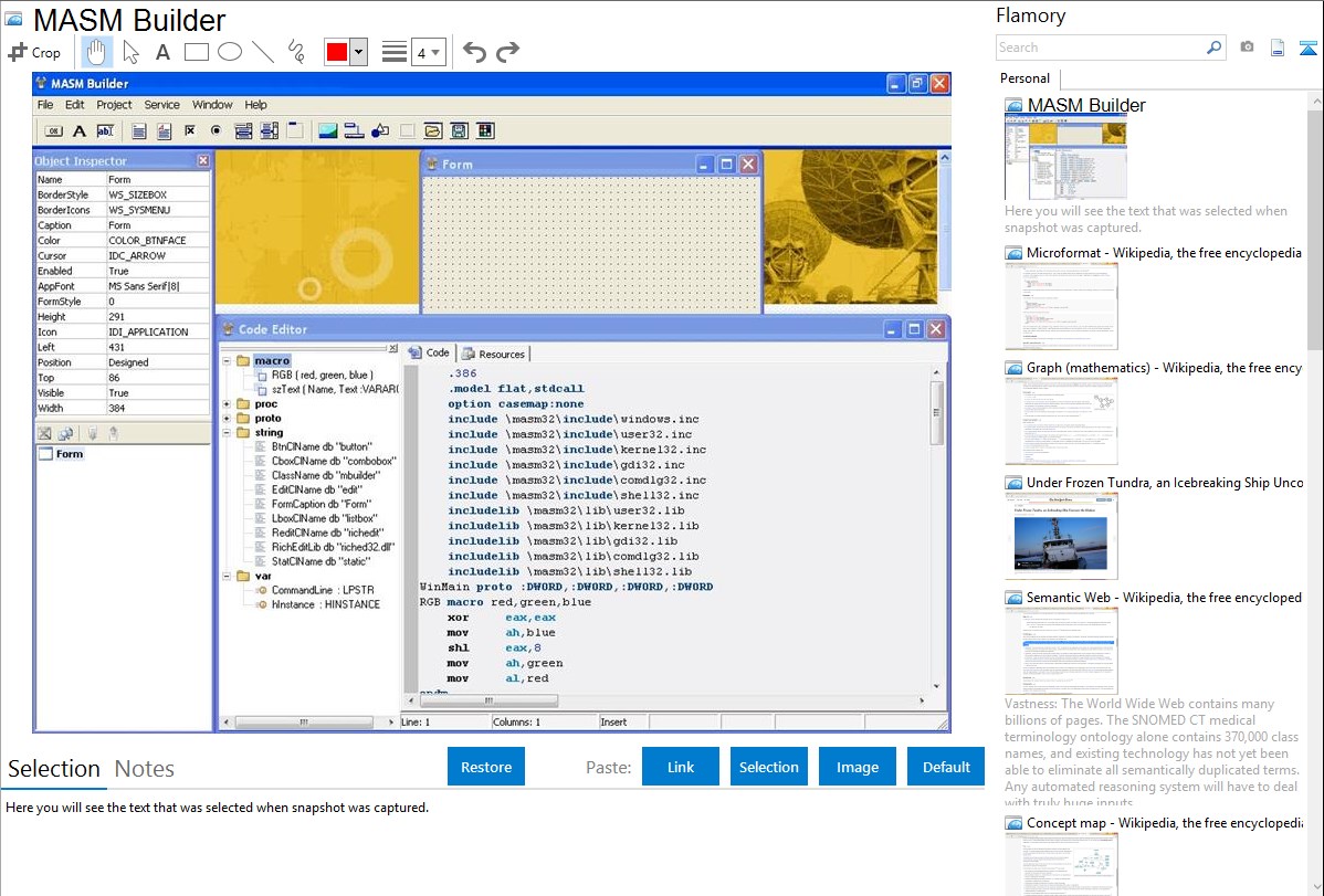 Flamory helps you capture and store screenshots from MASM Builder by pressing a single hotkey. It will be saved to a history, so you can continue doing your tasks without interruptions. Later, you can edit the screenshot: crop, resize, add labels and highlights. After that, you can paste the screenshot into any other document or e-mail message.