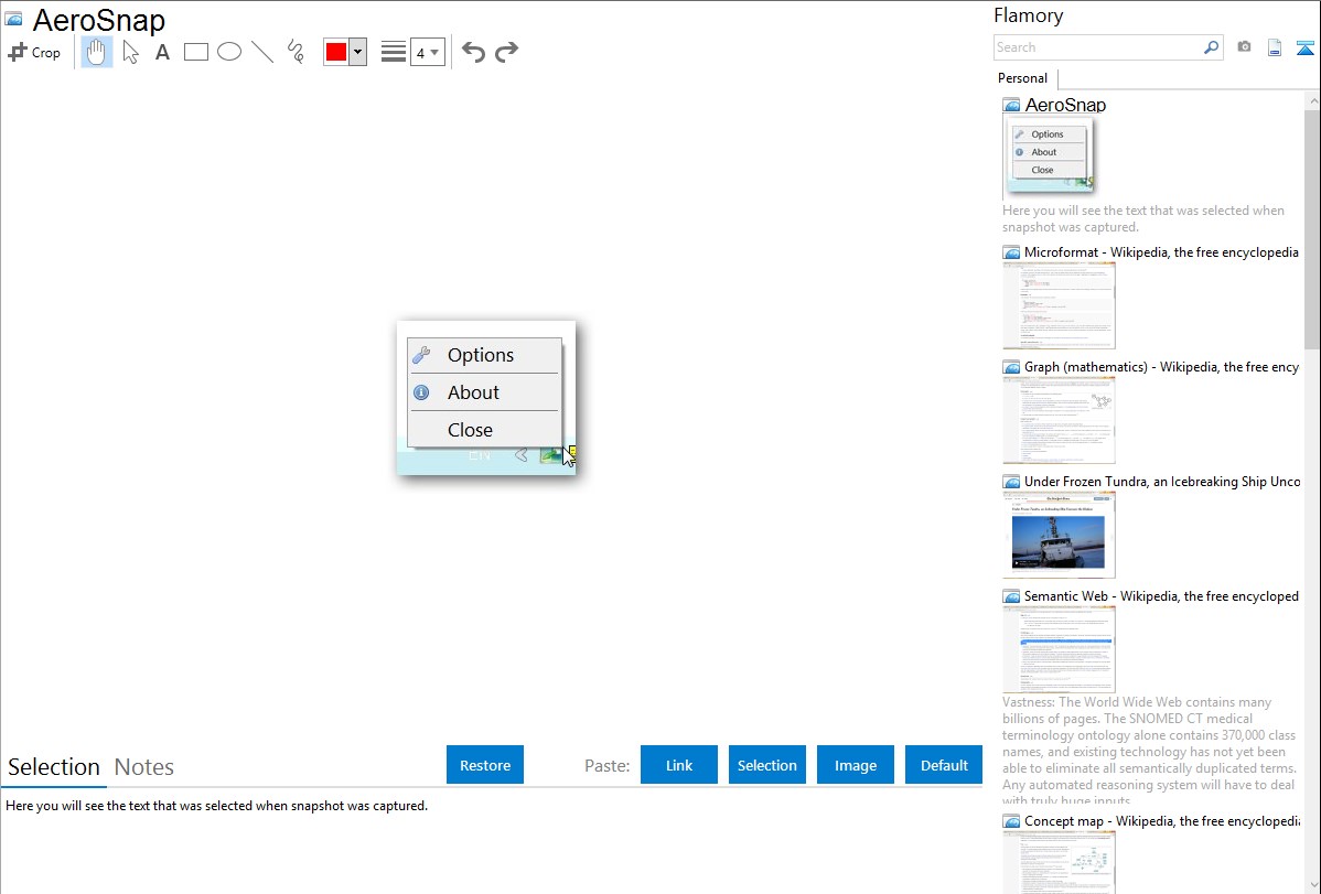Flamory helps you capture and store screenshots from AeroSnap by pressing a single hotkey. It will be saved to a history, so you can continue doing your tasks without interruptions. Later, you can edit the screenshot: crop, resize, add labels and highlights. After that, you can paste the screenshot into any other document or e-mail message.
