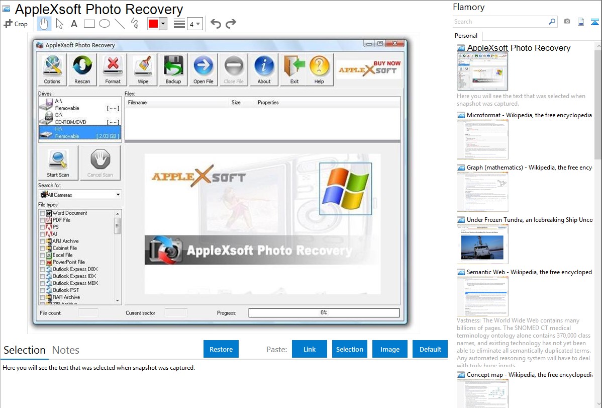 Flamory helps you capture and store screenshots from AppleXsoft Photo Recovery by pressing a single hotkey. It will be saved to a history, so you can continue doing your tasks without interruptions. Later, you can edit the screenshot: crop, resize, add labels and highlights. After that, you can paste the screenshot into any other document or e-mail message.
