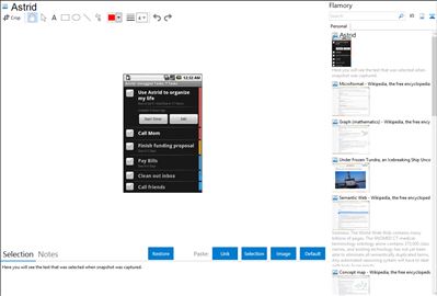 Flamory helps you capture and store screenshots from Astrid by pressing a single hotkey. It will be saved to a history, so you can continue doing your tasks without interruptions. Later, you can edit the screenshot: crop, resize, add labels and highlights. After that, you can paste the screenshot into any other document or e-mail message.