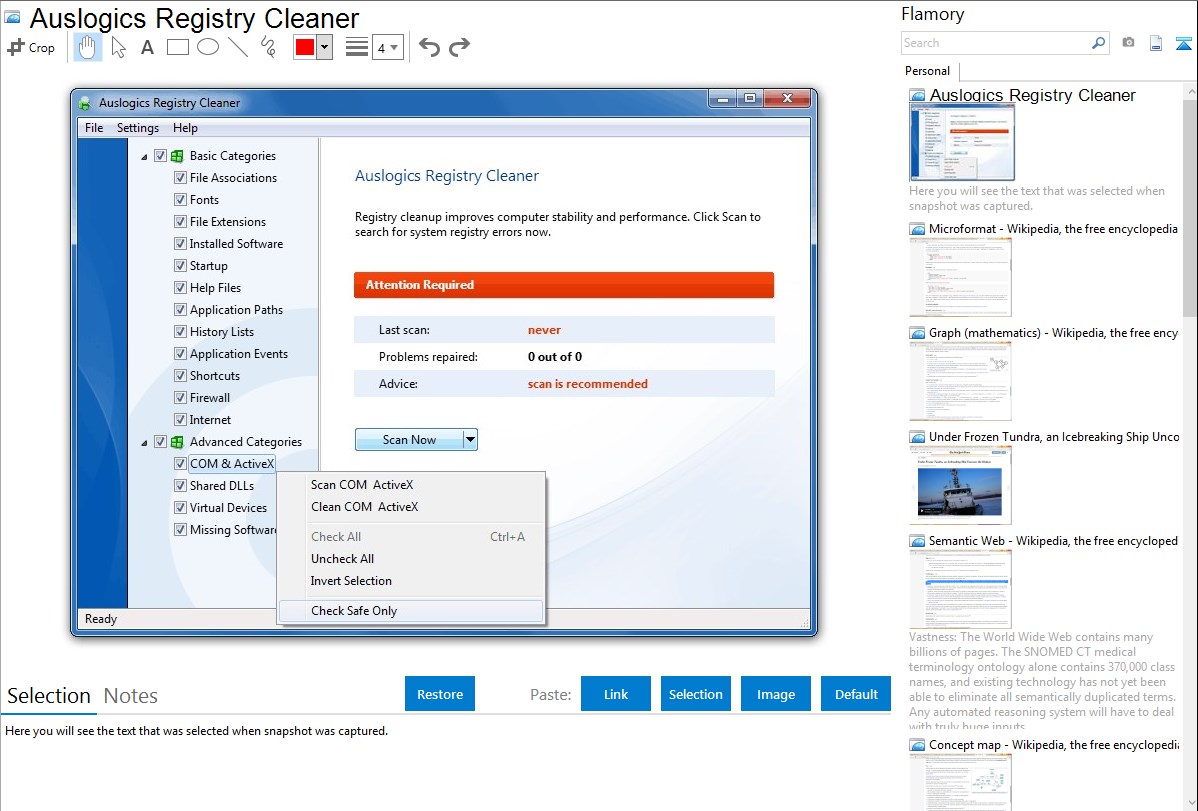 Flamory helps you capture and store screenshots from Auslogics Registry Cleaner by pressing a single hotkey. It will be saved to a history, so you can continue doing your tasks without interruptions. Later, you can edit the screenshot: crop, resize, add labels and highlights. After that, you can paste the screenshot into any other document or e-mail message.