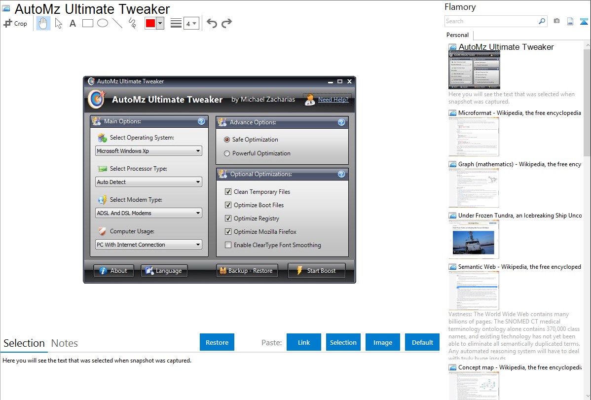 Flamory helps you capture and store screenshots from AutoMz Ultimate Tweaker by pressing a single hotkey. It will be saved to a history, so you can continue doing your tasks without interruptions. Later, you can edit the screenshot: crop, resize, add labels and highlights. After that, you can paste the screenshot into any other document or e-mail message.