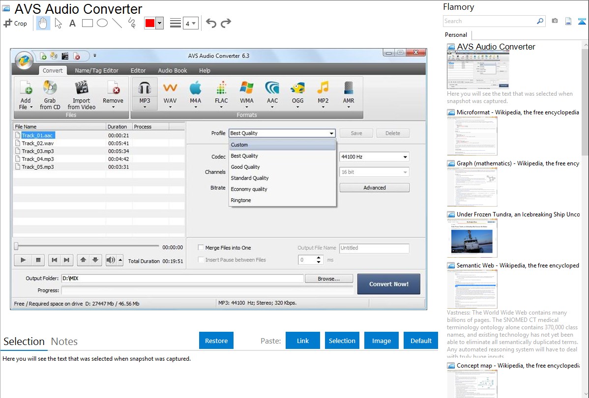 Flamory provides advanced bookmarking for AVS Audio Converter. It captures screen, selection, text of the document and other context. You can find this bookmark later using search by document content or looking through thumbnail list.