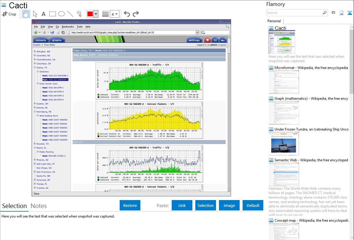 Flamory helps you capture and store screenshots from Cacti by pressing a single hotkey. It will be saved to a history, so you can continue doing your tasks without interruptions. Later, you can edit the screenshot: crop, resize, add labels and highlights. After that, you can paste the screenshot into any other document or e-mail message.