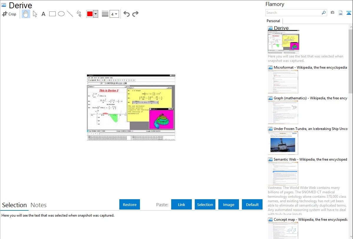 Flamory helps you capture and store screenshots from Derive by pressing a single hotkey. It will be saved to a history, so you can continue doing your tasks without interruptions. Later, you can edit the screenshot: crop, resize, add labels and highlights. After that, you can paste the screenshot into any other document or e-mail message.
