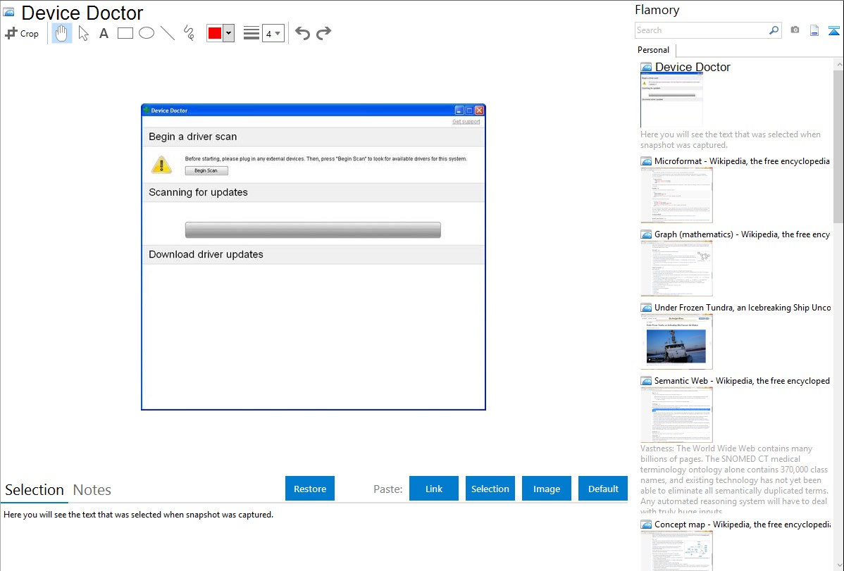 Flamory helps you capture and store screenshots from Device Doctor by pressing a single hotkey. It will be saved to a history, so you can continue doing your tasks without interruptions. Later, you can edit the screenshot: crop, resize, add labels and highlights. After that, you can paste the screenshot into any other document or e-mail message.