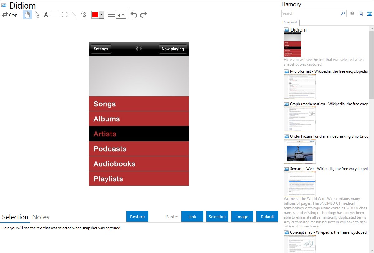 Flamory helps you capture and store screenshots from Didiom by pressing a single hotkey. It will be saved to a history, so you can continue doing your tasks without interruptions. Later, you can edit the screenshot: crop, resize, add labels and highlights. After that, you can paste the screenshot into any other document or e-mail message.