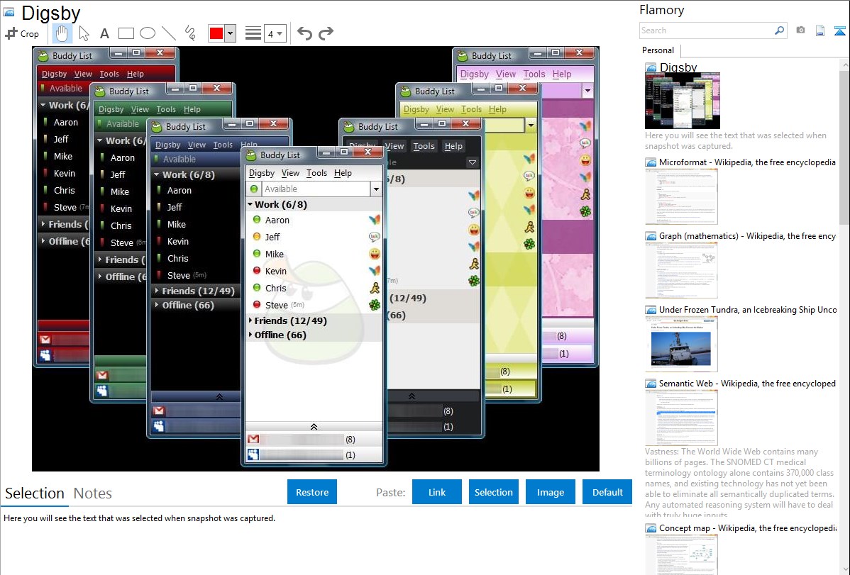Flamory helps you capture and store screenshots from Digsby by pressing a single hotkey. It will be saved to a history, so you can continue doing your tasks without interruptions. Later, you can edit the screenshot: crop, resize, add labels and highlights. After that, you can paste the screenshot into any other document or e-mail message.