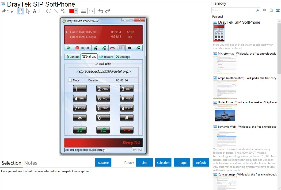 Flamory helps you capture and store screenshots from DrayTek SIP SoftPhone by pressing a single hotkey. It will be saved to a history, so you can continue doing your tasks without interruptions. Later, you can edit the screenshot: crop, resize, add labels and highlights. After that, you can paste the screenshot into any other document or e-mail message.