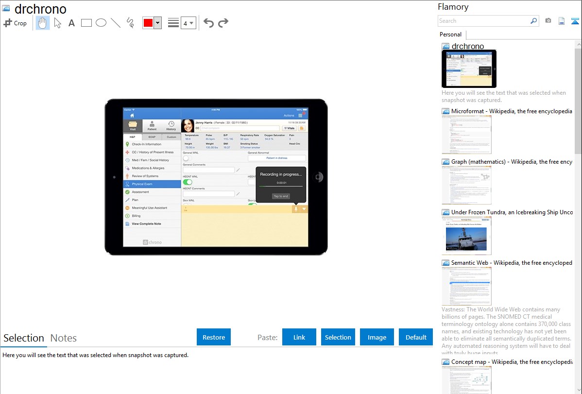Flamory helps you capture and store screenshots from drchrono by pressing a single hotkey. It will be saved to a history, so you can continue doing your tasks without interruptions. Later, you can edit the screenshot: crop, resize, add labels and highlights. After that, you can paste the screenshot into any other document or e-mail message.