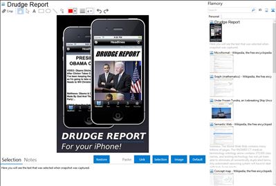 Flamory helps you capture and store screenshots from Drudge Report by pressing a single hotkey. It will be saved to a history, so you can continue doing your tasks without interruptions. Later, you can edit the screenshot: crop, resize, add labels and highlights. After that, you can paste the screenshot into any other document or e-mail message.