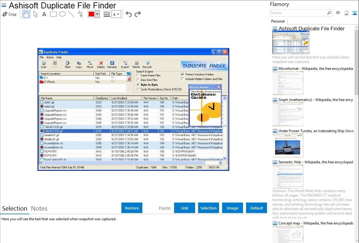 Flamory helps you capture and store screenshots from Ashisoft Duplicate File Finder by pressing a single hotkey. It will be saved to a history, so you can continue doing your tasks without interruptions. Later, you can edit the screenshot: crop, resize, add labels and highlights. After that, you can paste the screenshot into any other document or e-mail message.