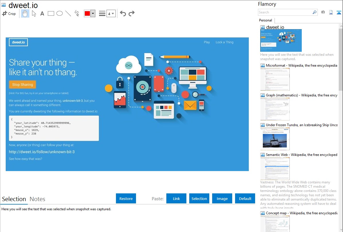 Flamory helps you capture and store screenshots from dweet.io by pressing a single hotkey. It will be saved to a history, so you can continue doing your tasks without interruptions. Later, you can edit the screenshot: crop, resize, add labels and highlights. After that, you can paste the screenshot into any other document or e-mail message.