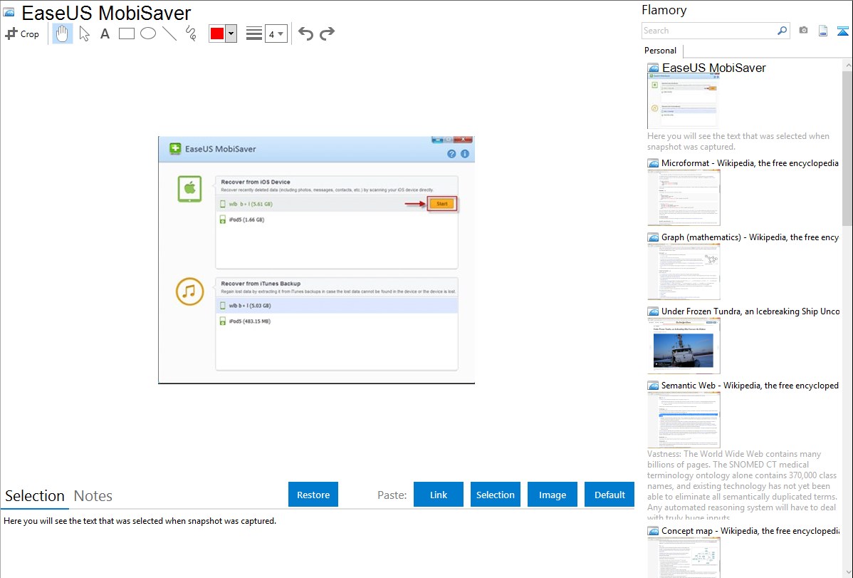 Flamory helps you capture and store screenshots from EaseUS MobiSaver by pressing a single hotkey. It will be saved to a history, so you can continue doing your tasks without interruptions. Later, you can edit the screenshot: crop, resize, add labels and highlights. After that, you can paste the screenshot into any other document or e-mail message.