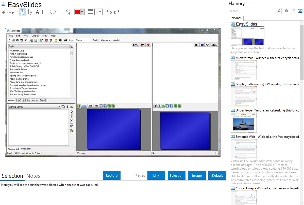 EasySlides is a FREE Song Projection Software designed for projecting lyrics and Bible texts, with a video projector, onto a large screen during Christian Worship.